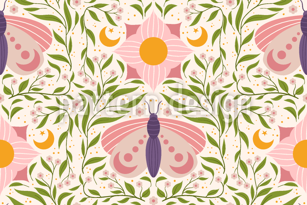 | Descrizione | Whimsy Wings, incantevole danza della falena tra fiori rosa e foglie verdeggianti su una tela beige chiaro | ||