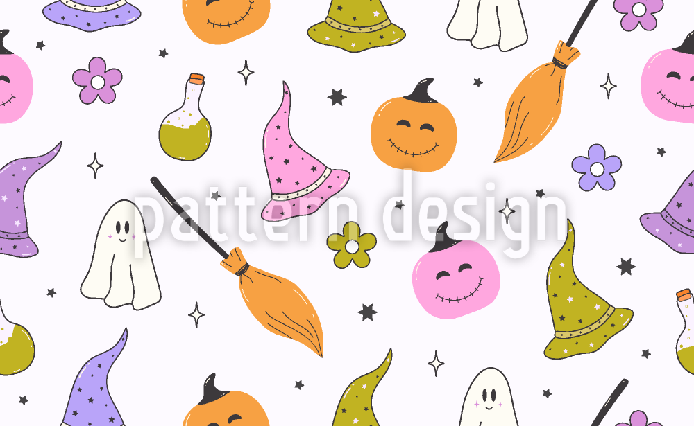 | Descrizione | Grazioso motivo di Halloween con zucche, fantasmi, scope, fiori, cappello da mago, pozioni e scintillii. | ||