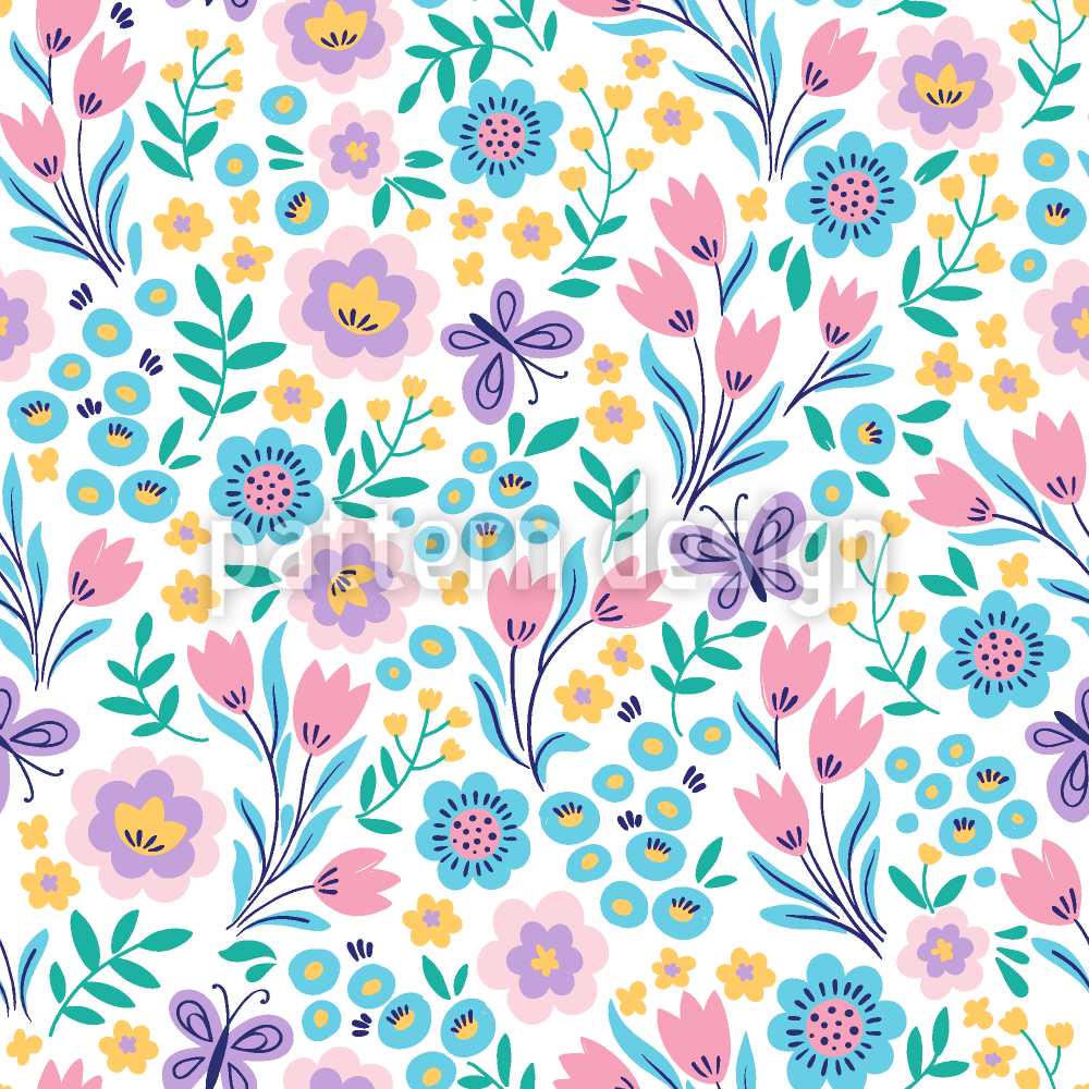 | Descrizione | Delicato motivo floreale con piccoli fiori di prato e farfalle stilizzati color pastello. | ||