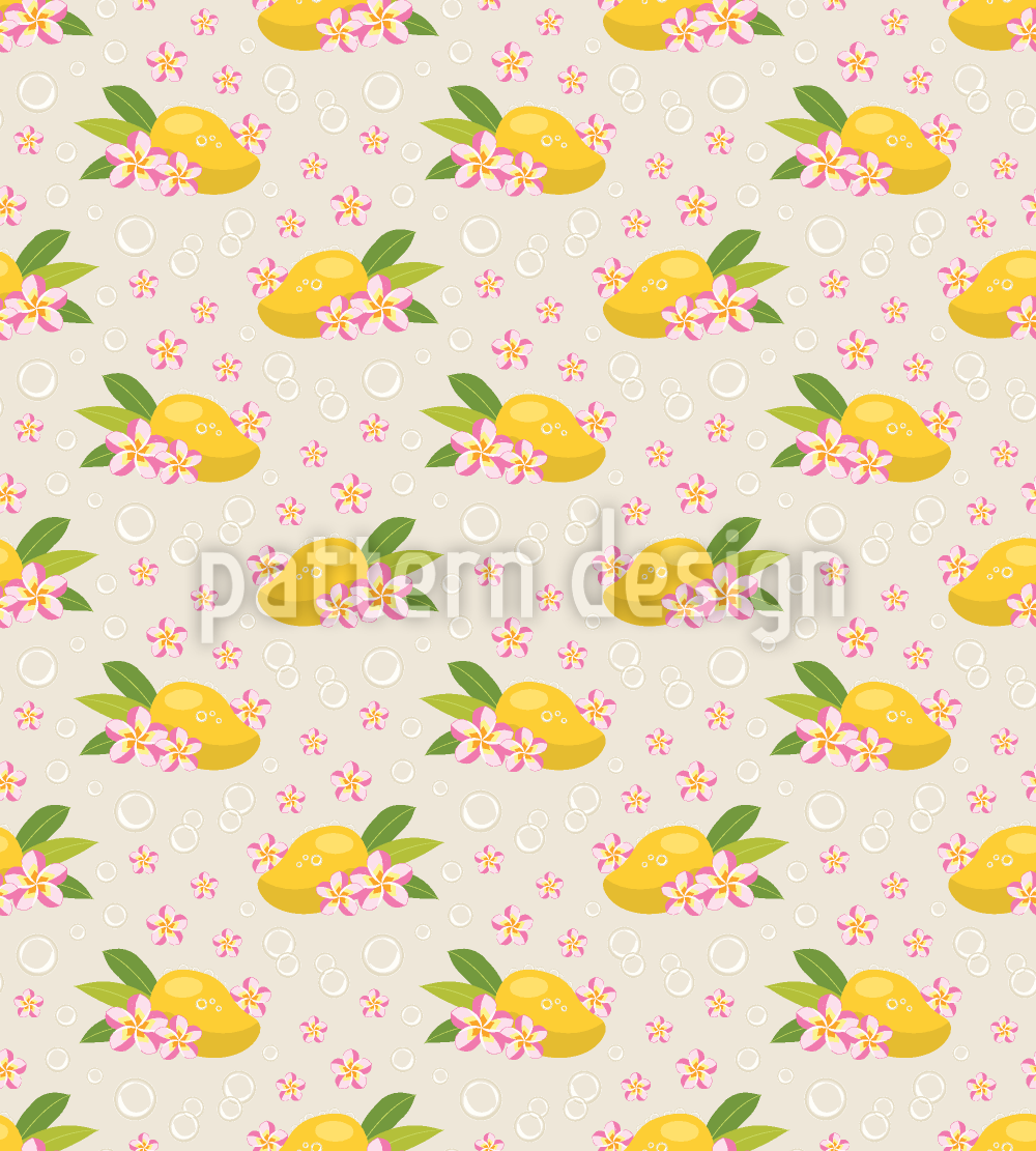 | Descrizione | Motivo estivo con mango, fiori di plumeria e bolle galleggianti. | ||