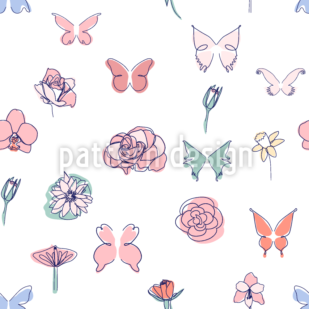 | Descrizione | Modello senza cuciture con illustrazioni a una riga di farfalle e fiori. | ||
