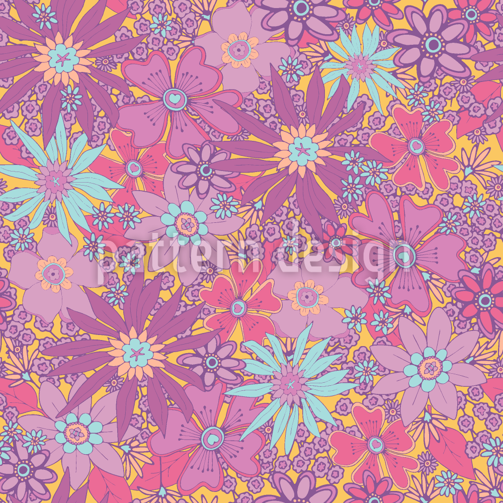 | Descrizione | Un audace motivo floreale su tutta la superficie ripetuto a mezza goccia ispirato ai motivi flower power degli anni '60 e '70. | ||