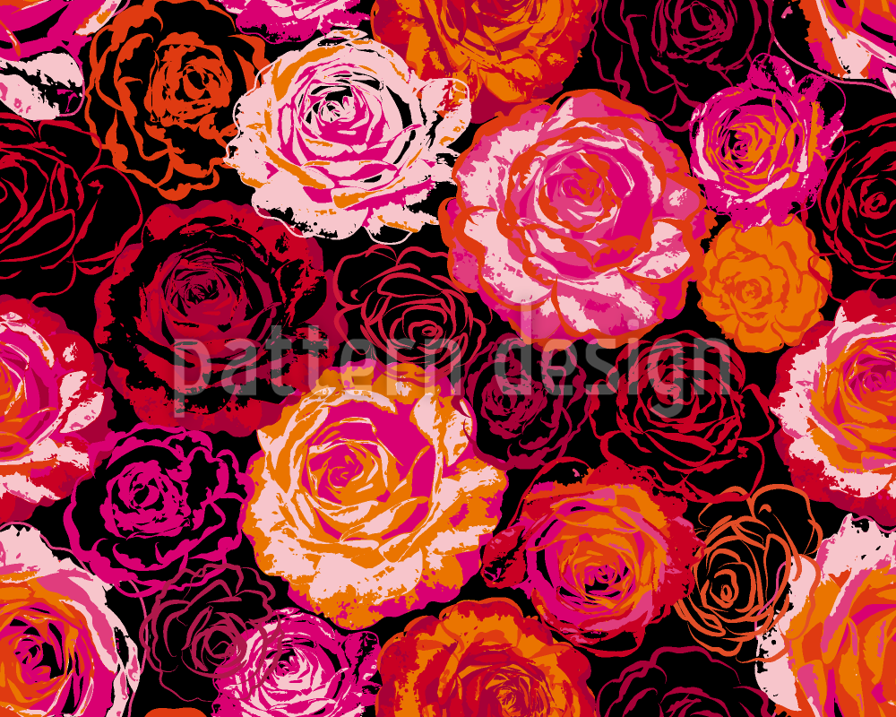 | Descrizione | Ornamenti di fiori di rosa stilizzati colorati su uno sfondo di colore nero. | ||