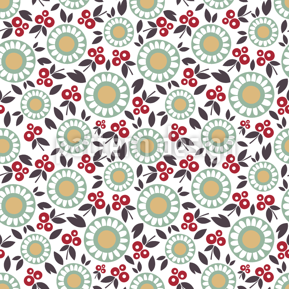 | 説明 | 定型化された花、葉、果実のロマンチックなデザイン。 | ||