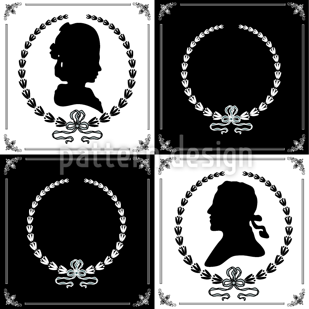 | 説明 | カメオとしてのプロファイルで女性と男性のシルエット。ビクトリア朝様式の白と黒のオールドファッションパターン。 | ||