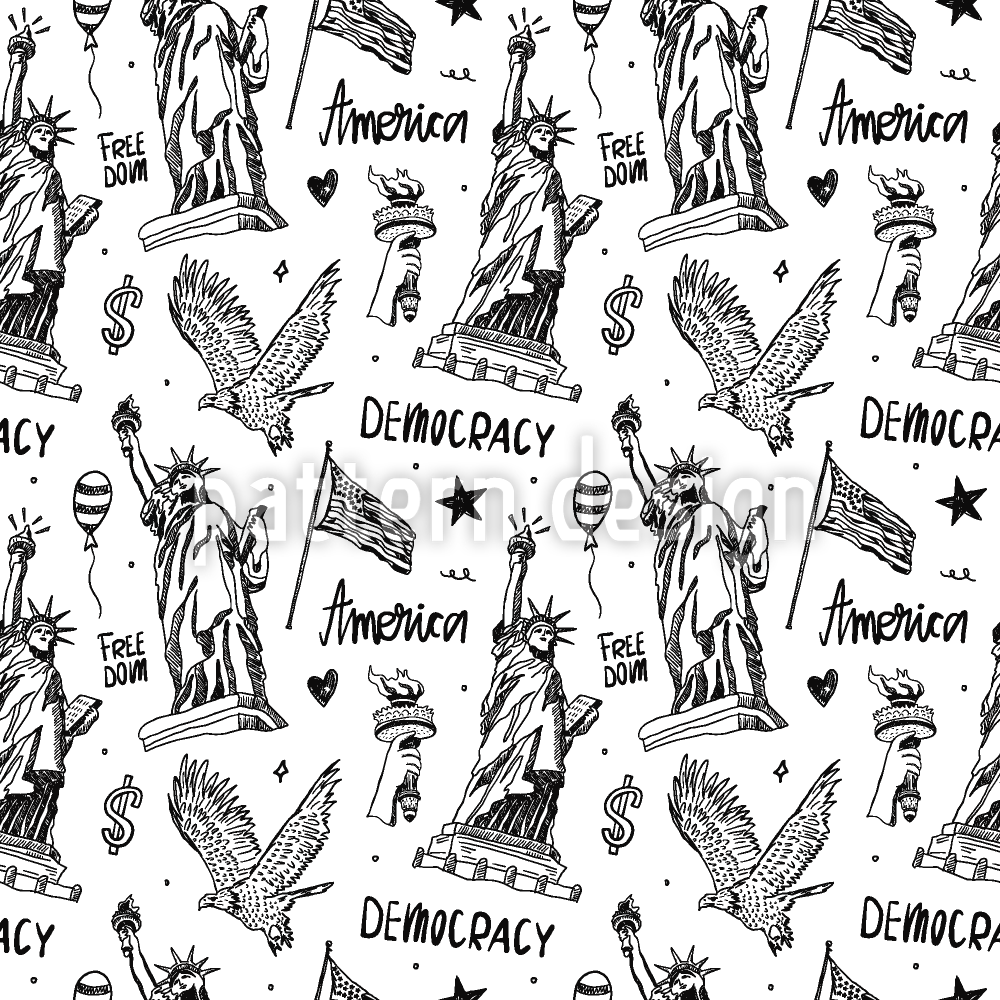 | 説明 | 自由の女神、旗、ワシなどのアメリカのシンボルが散りばめられたシームレスなモノクロパターンデザイン。 | ||