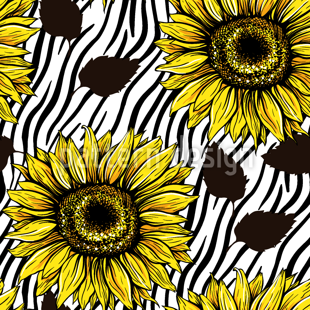 | 説明 | ゼブラストライプにひまわりと葉が散在するシームレスパターンデザイン。 | ||