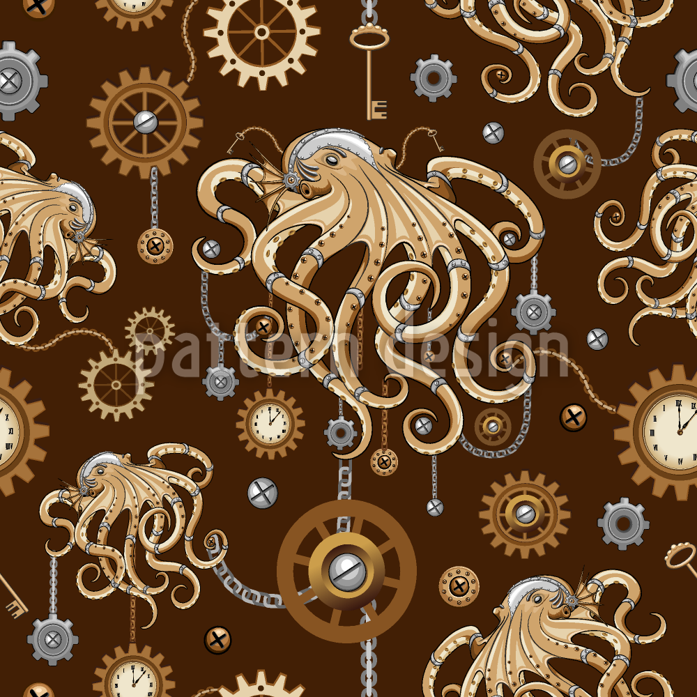 | 説明 | シュールでゴシック調のスチームパンクなタコに、時計、ギア、ボルト、キー、チェーンをあしらった、継ぎ目のない柄がリピートされています。 | ||