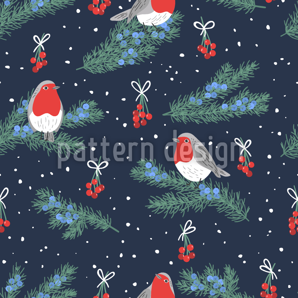 | 説明 | 斑点のある背景にジュニパーの小枝とコマドリのシームレスパターン。 | ||