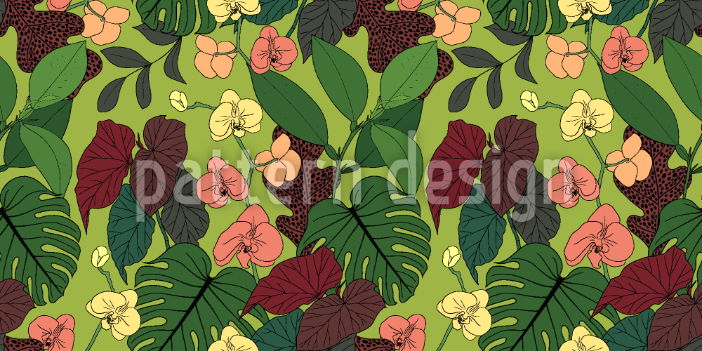 | 説明 | 熱帯植物と咲く蘭で作られた花柄のシームレスなベクターパターン。 | ||