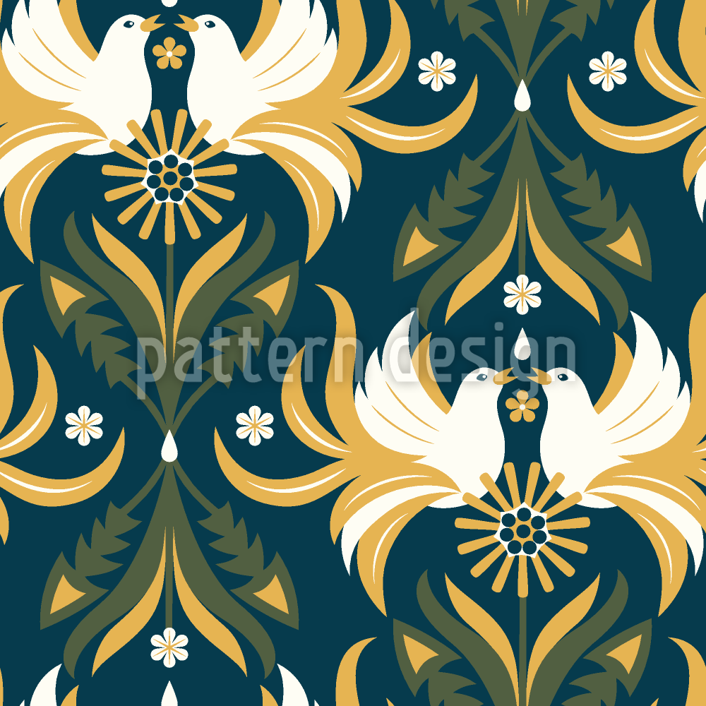 | 説明 | 様式化されたタンポポの間を飛ぶ鳩のダマスク織の装飾を示すシームレスなベクターパターン。 | ||