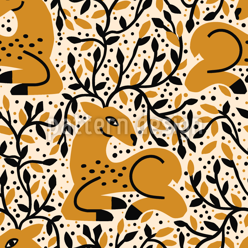 | 説明 | 枝角が葉で覆われた小枝に流れ込む休息中の森の鹿は、民俗風の森の雰囲気を呼び起こします。 | ||