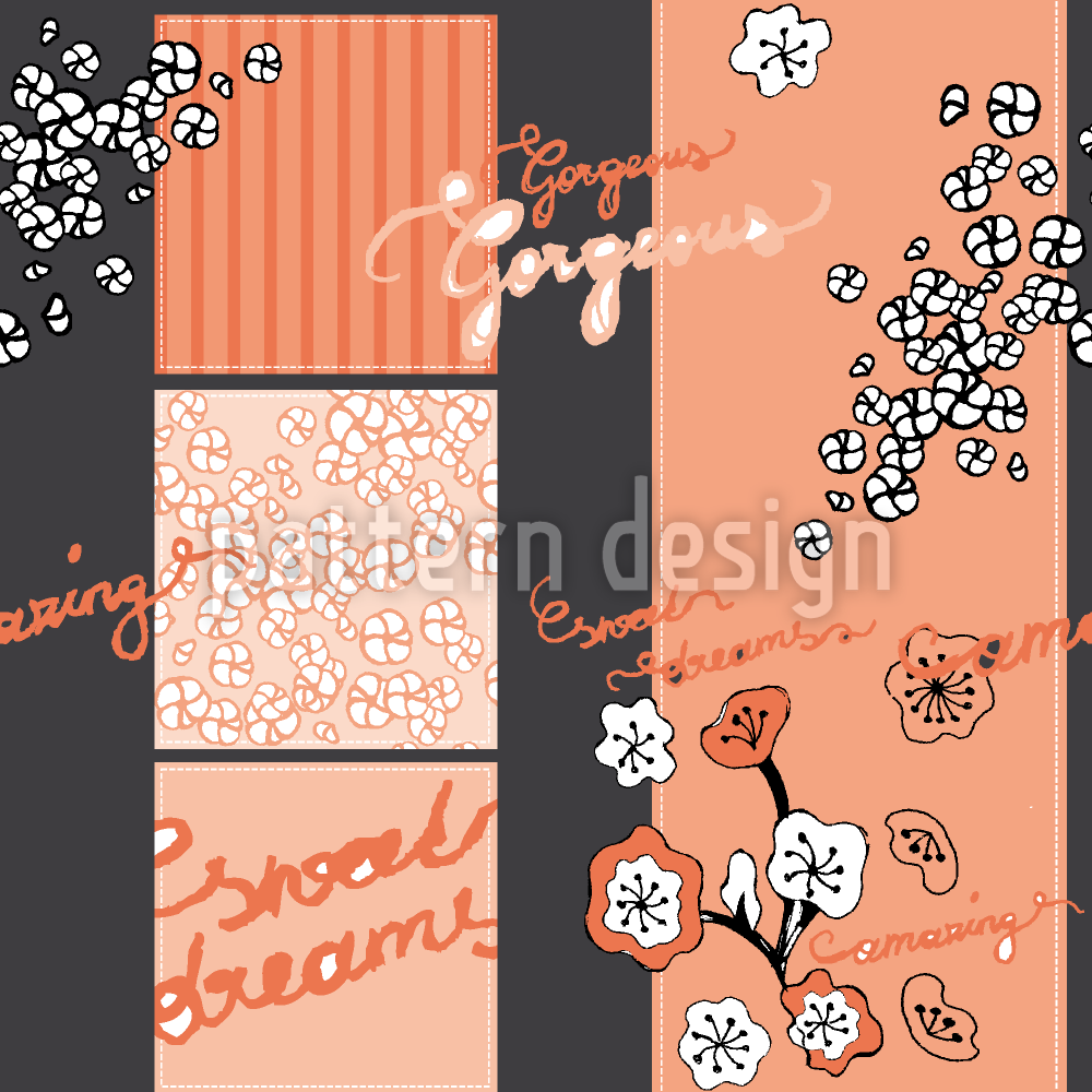 | 説明 | さまざまなパターンの縫製要素、手書き、花のイラストを使用したパッチワーク風のデザイン。 | ||