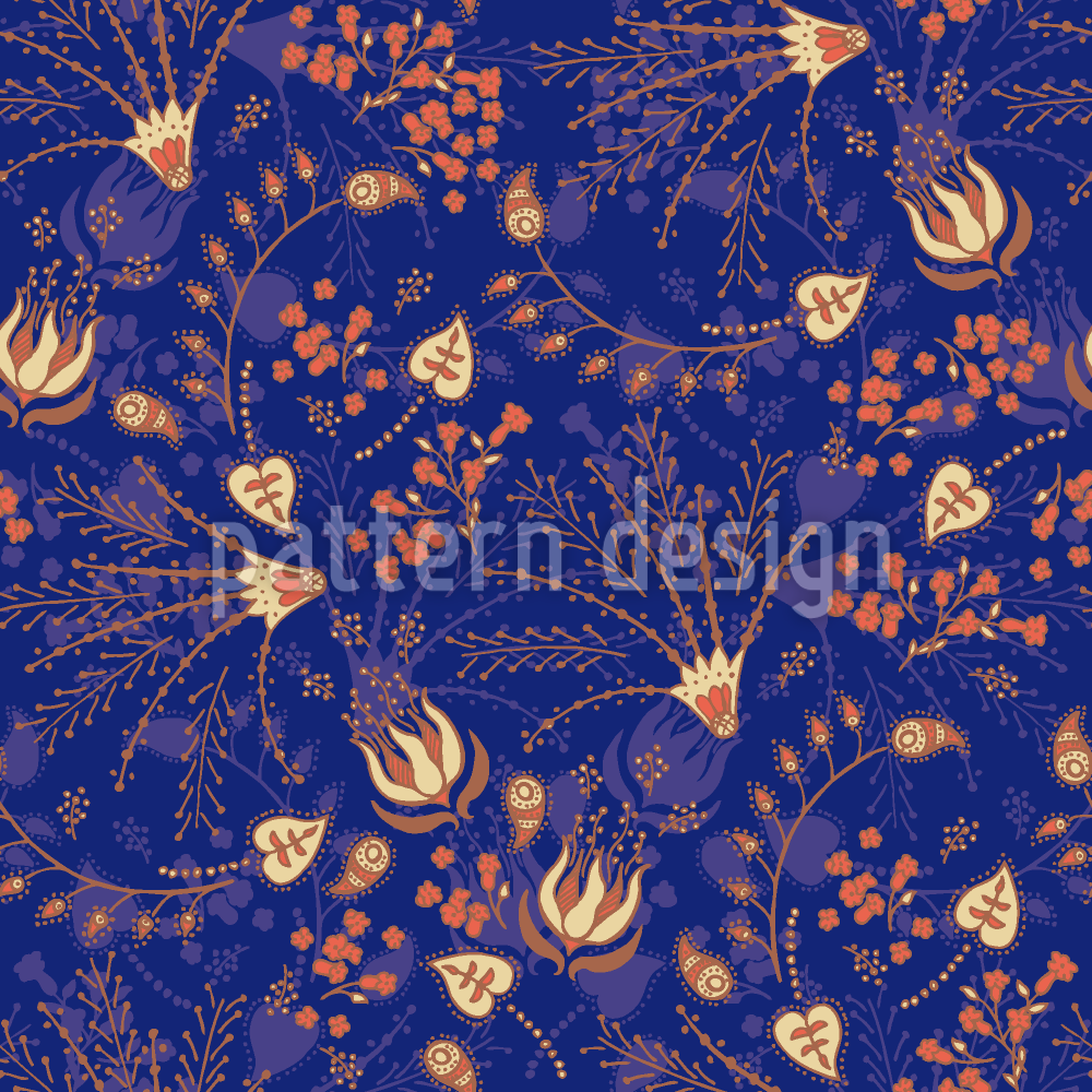 | 説明 | ダークブルーの背景にさまざまな葉のオーナメントが魅了されるデザイン。 | ||