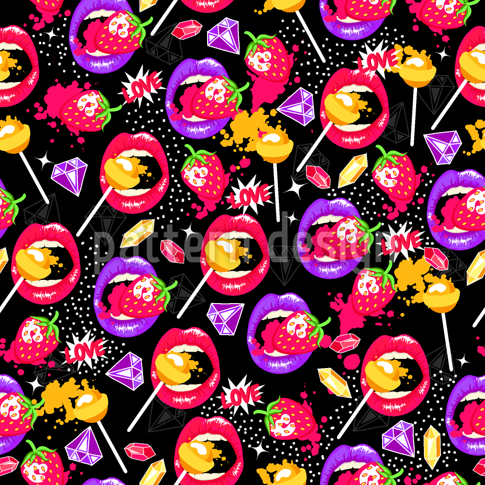 | 설명 | 입술, 딸기, 막대 사탕과 다이아몬드가 있는 매끄러운 패턴. | ||