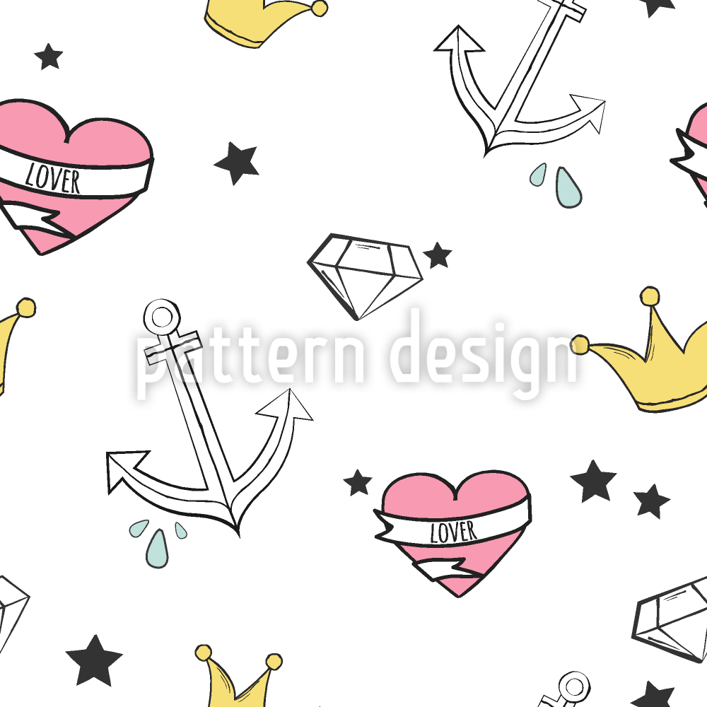 | 설명 | 앵커, 하트, 크라운 및 다이아몬드의 그림이있는 귀여운 이음매없는 패턴. | ||
