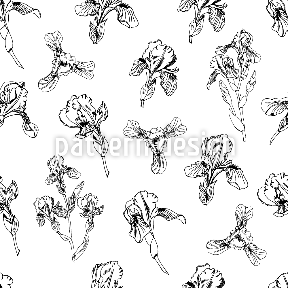 | 설명 | 흩어져있는 꽃다발과 홍채 꽃의 단일 봉오리가 있는 매끄러운 흑백 패턴입니다. | ||