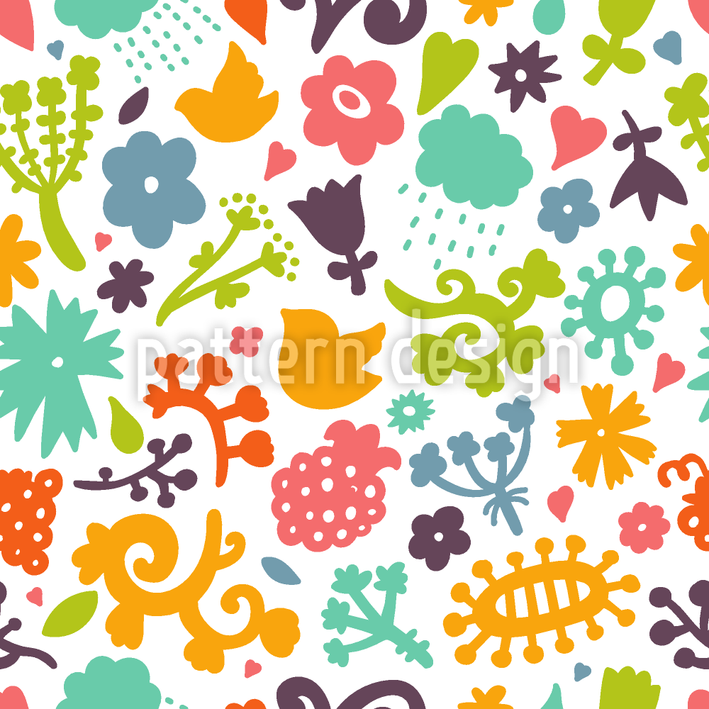 | 설명 | 흩어져있는 새, 꽃, 비 구름 및 식물이있는 양식화 된 봄 패턴. | ||