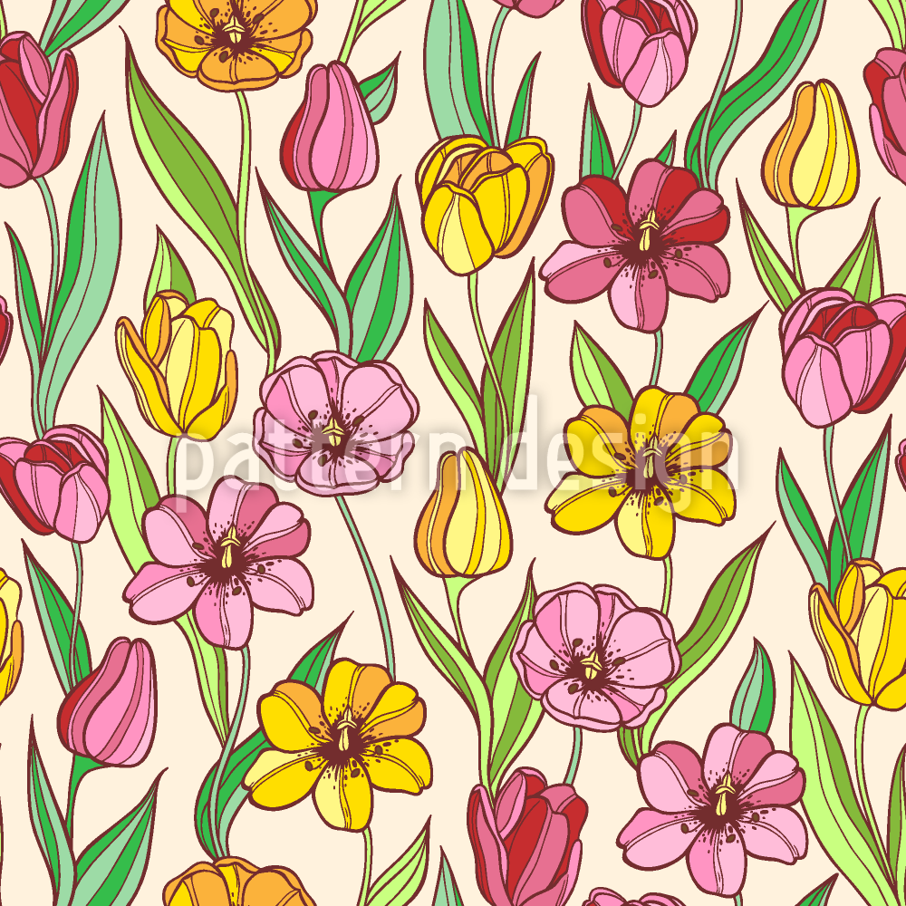 | 설명 | 다채로운 튤립이 흩어져있는 원활한 봄 패턴 디자인. | ||