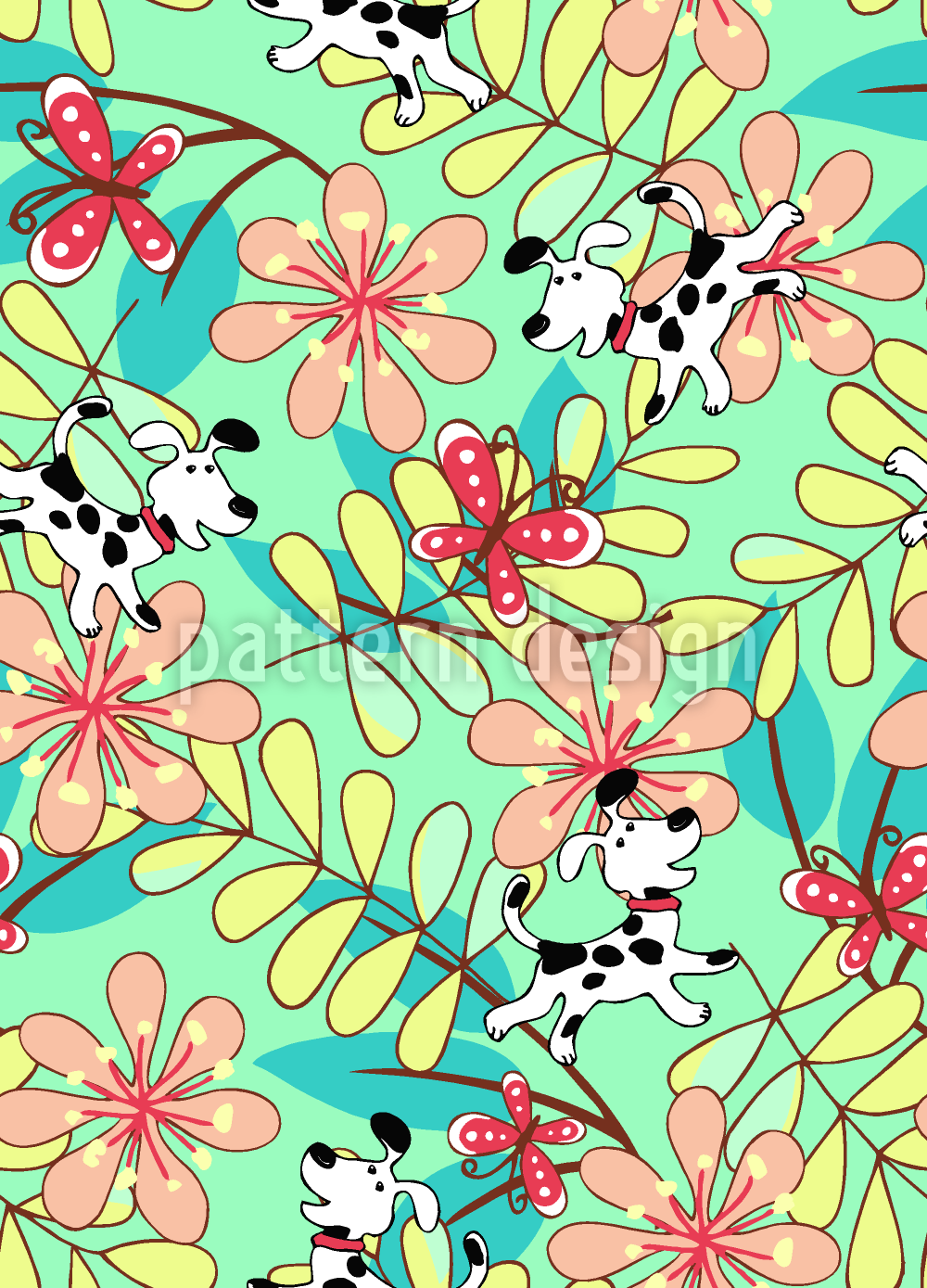 | 설명 | 꽃밭에 롤릭 개와 나비가 있는 사랑스럽고 생동감 넘치는 디자인. | ||