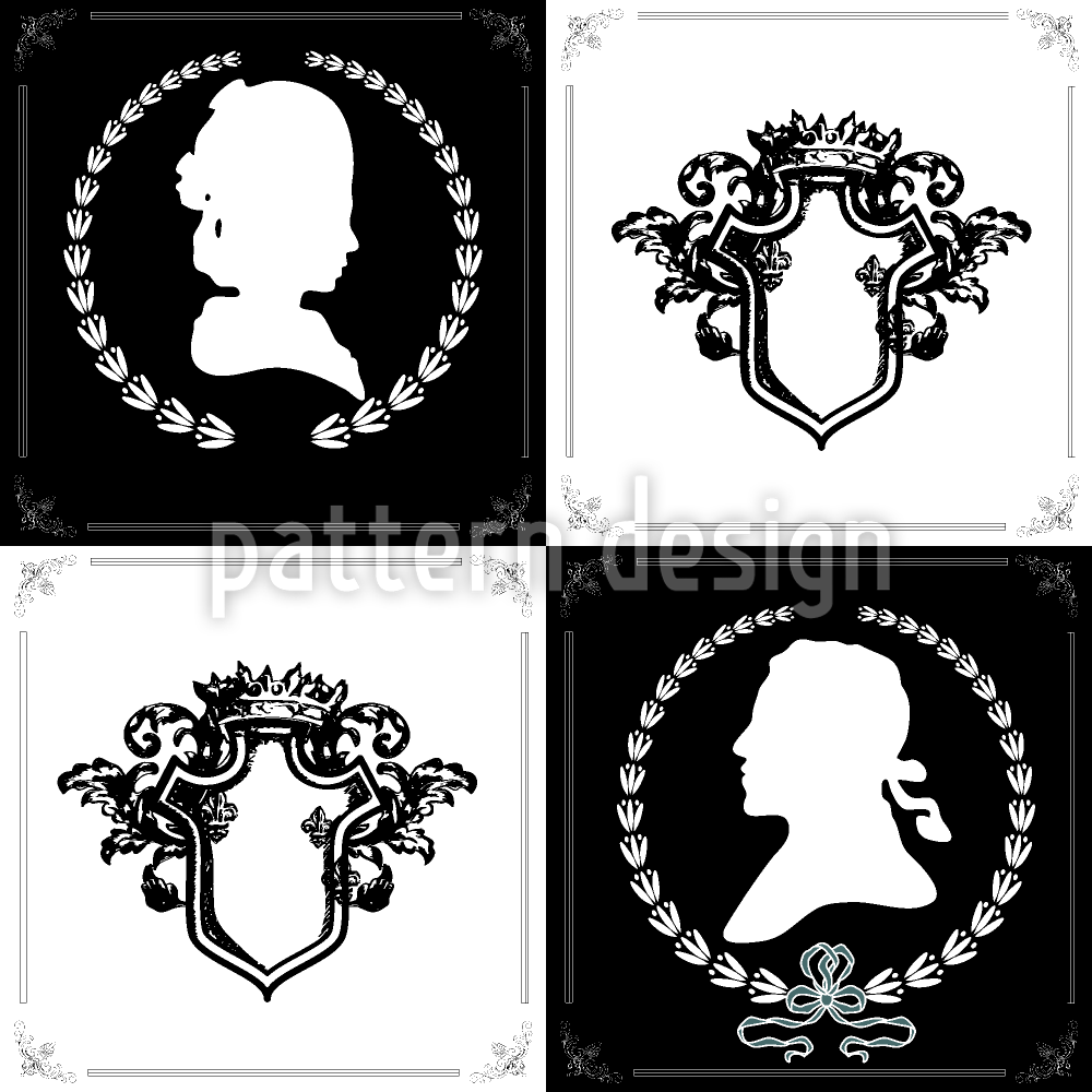 | Omschrijving | Vrouwelijke silhouetten en mantel van een arm. Wit en zwart ouderwetse patroon in Victoriaanse stijl. | ||