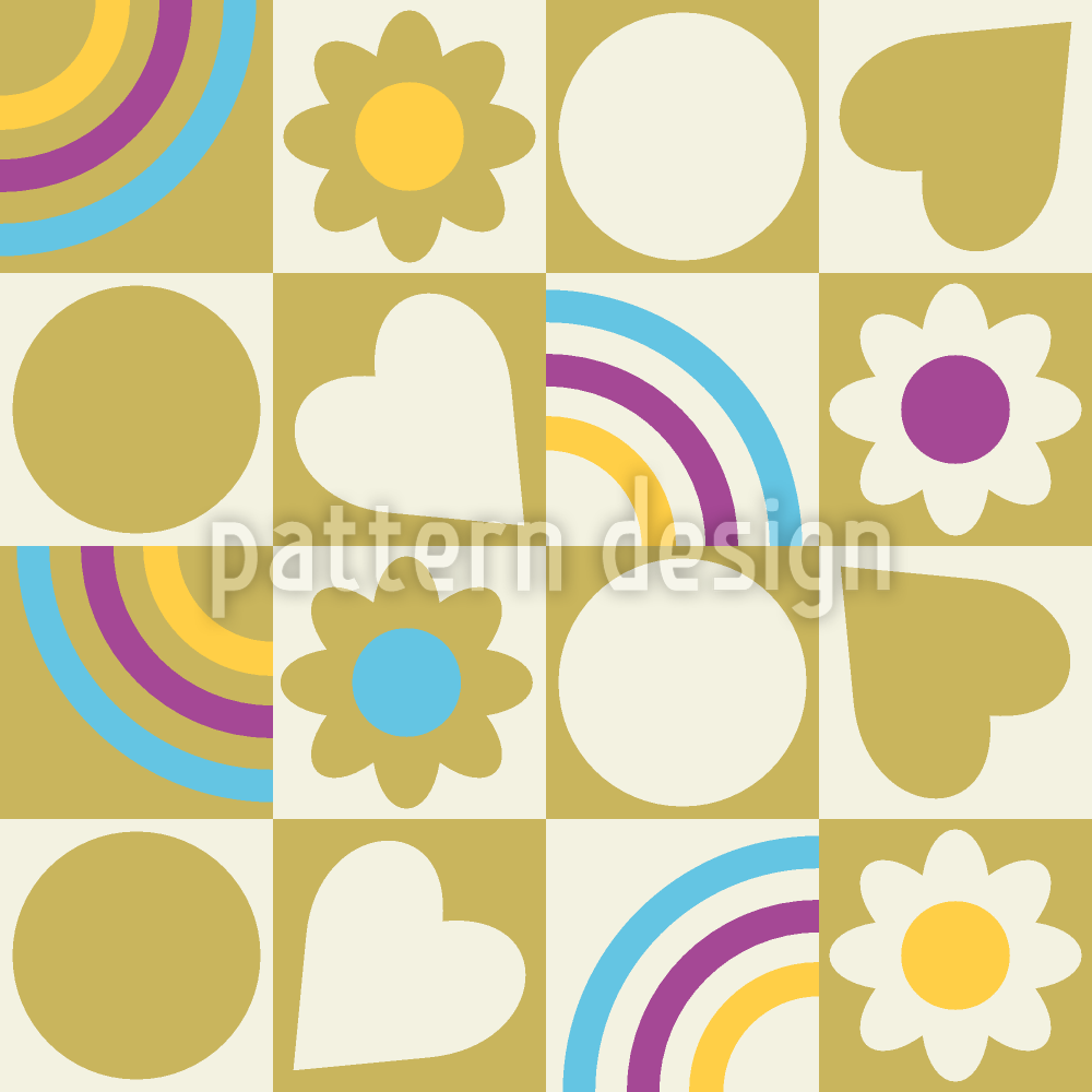| Omschrijving | Een geometrisch papaverpatroon met hartjes, bloemen en regenbogen. | ||