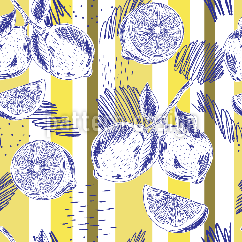 | Omschrijving | Een levendig naadloos patroon in mediterrane stijl met handgetekende citroenschetsen in donkerblauwe inkt op een zonnige gestreepte achtergrond. | ||