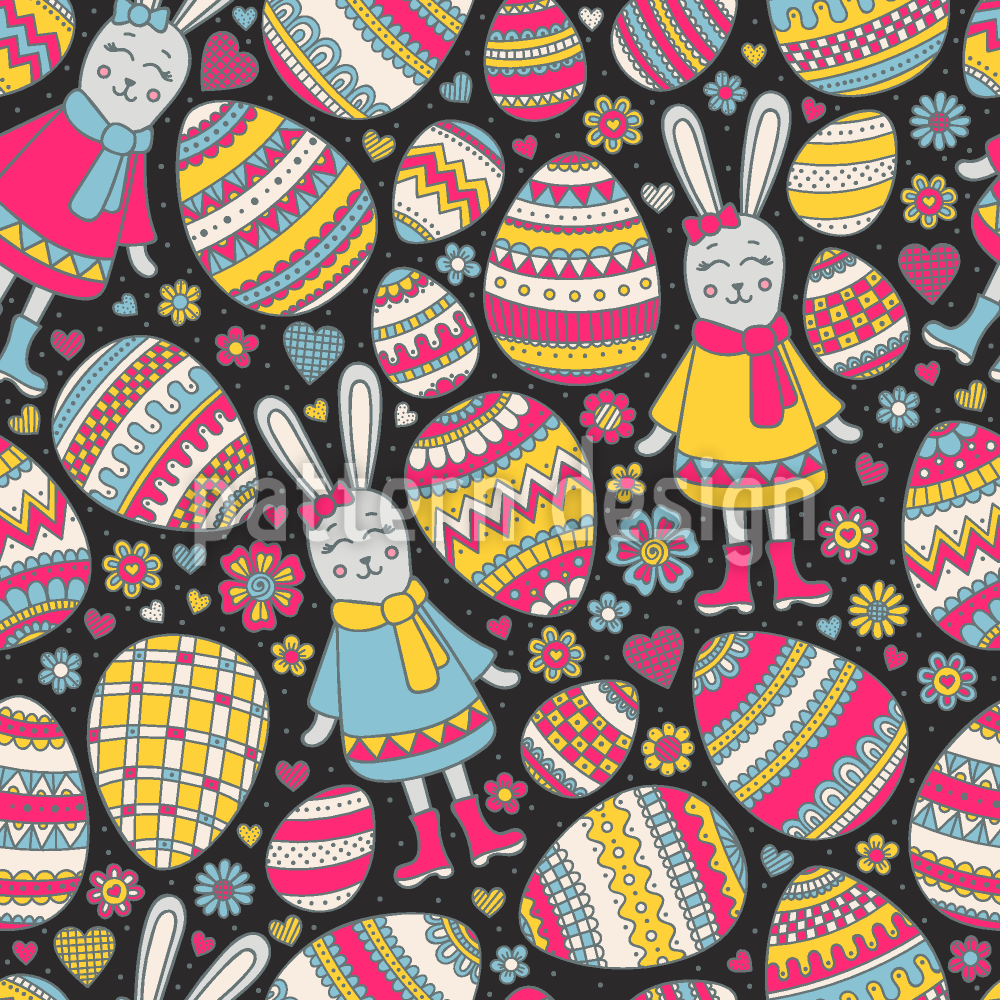 | Beskrivelse | Sømløst påskemønster med doodle illustrasjoner av kaniner, egg og hjerter. | ||