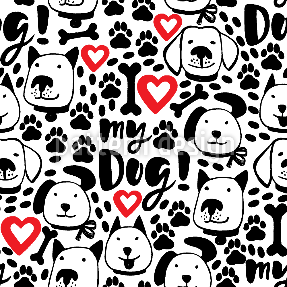 | Beskrivelse | Sømløs børstebokstavermønster med spredte poter, bein, hjerter og hundeansikter. | ||
