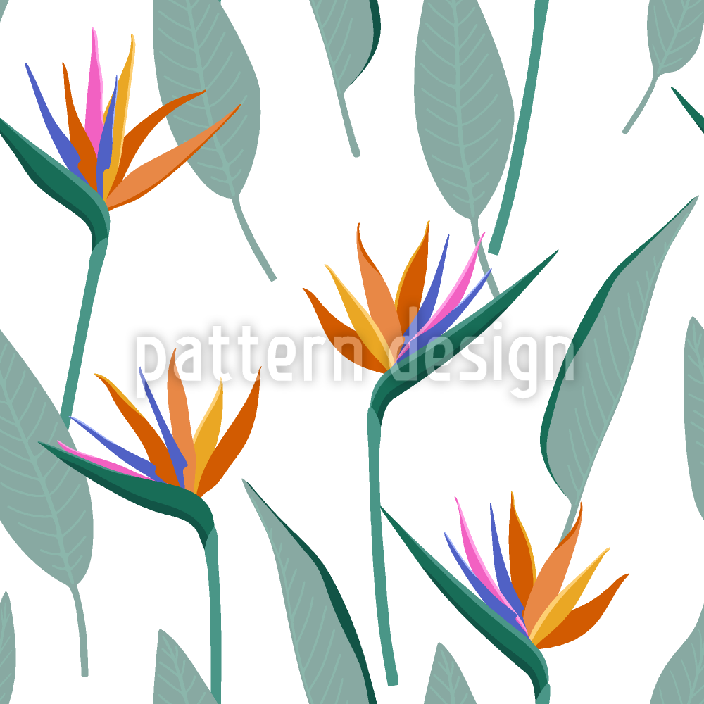 | Beskrivelse | Sømløst mønster med fugl av paradis blomster og blader. | ||