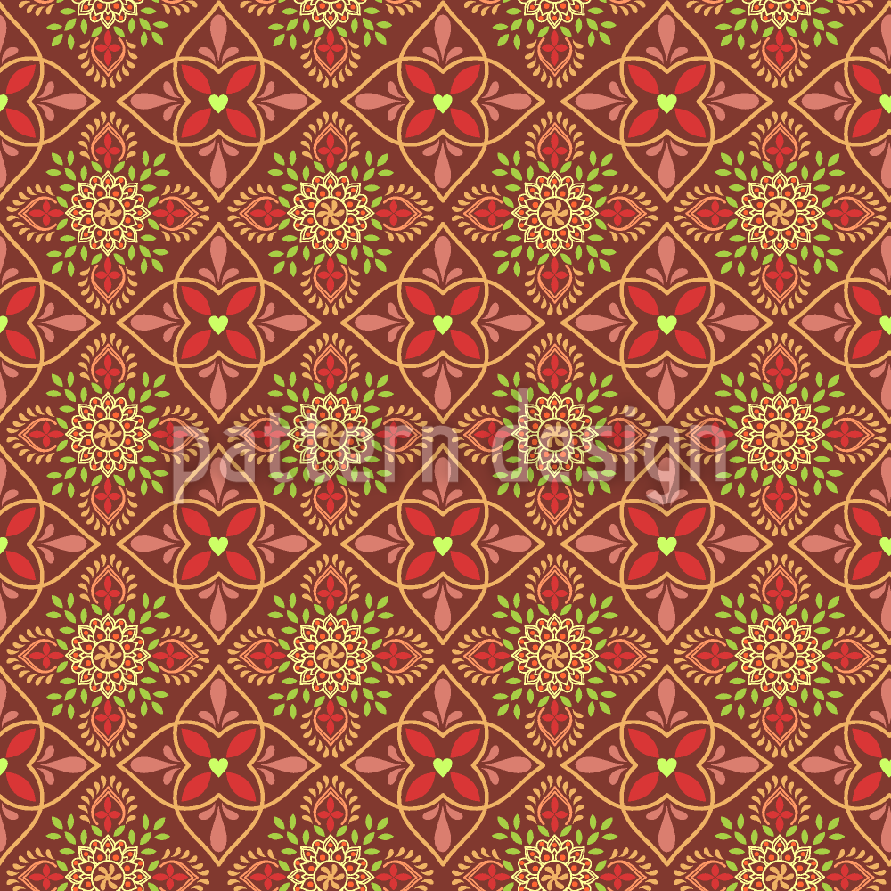| Beskrivelse | Et mønster av symmetriske kronblader og blader i varme myke rødbrune fargetoner som representerer jording og stabilitet, og fremkaller antikke byer terrakottakeramikk og middelhavskunst. | ||