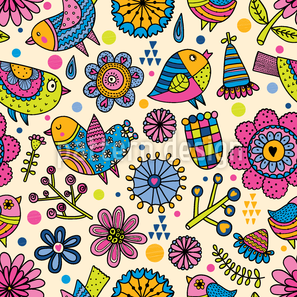 | Descrição | Padrão sem emenda com pássaros felizes no jardim. | ||