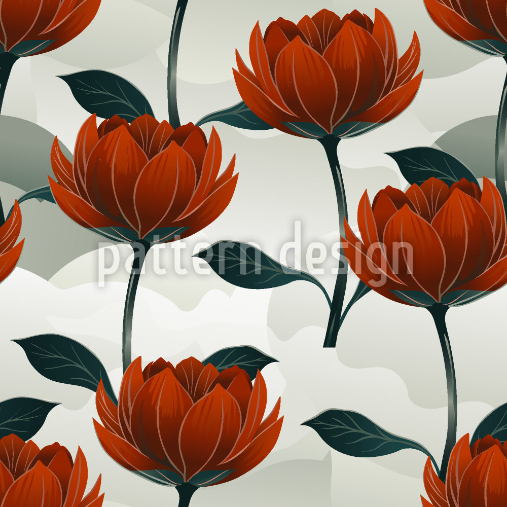 | Описание | Узор с большим алым цветущим цветком на стебле с листьями на фоне пышных облаков. | ||