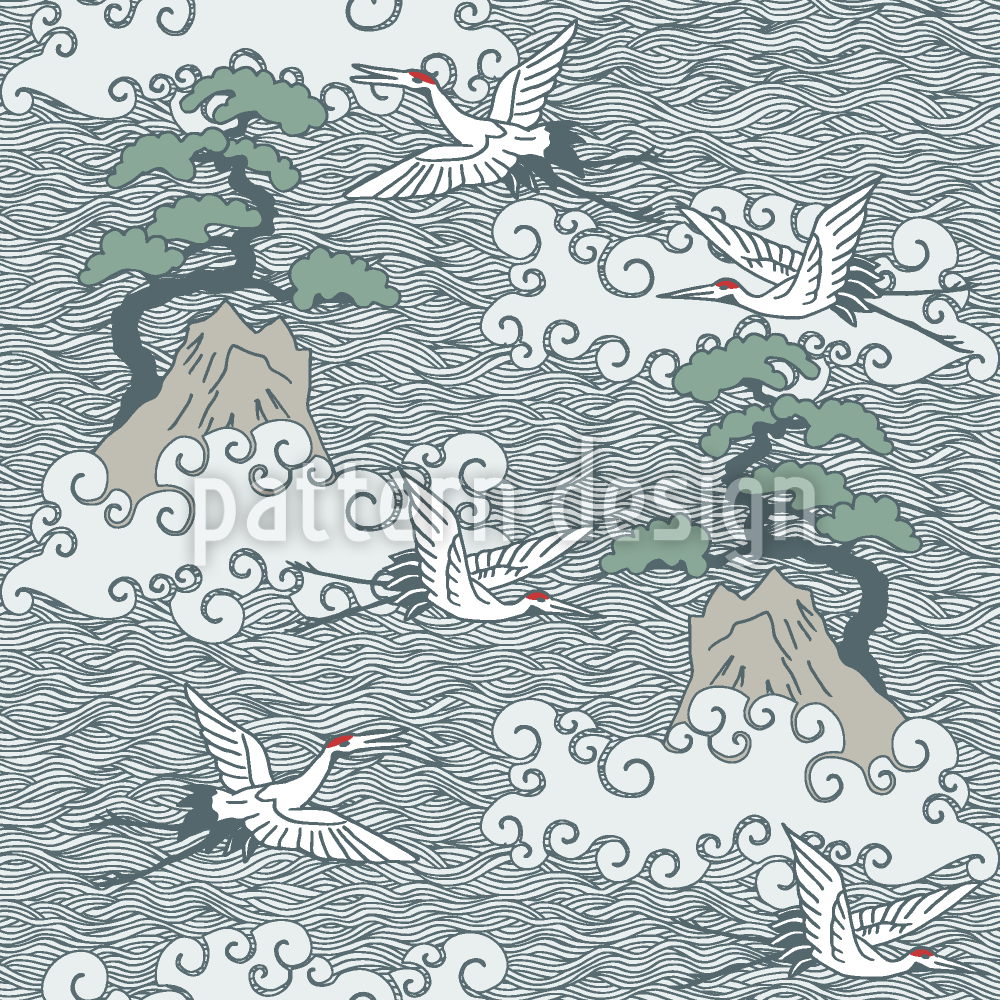 | Beskrivning | Handritad japansk stil illustration av kranar, stenar och träd i havet. | ||