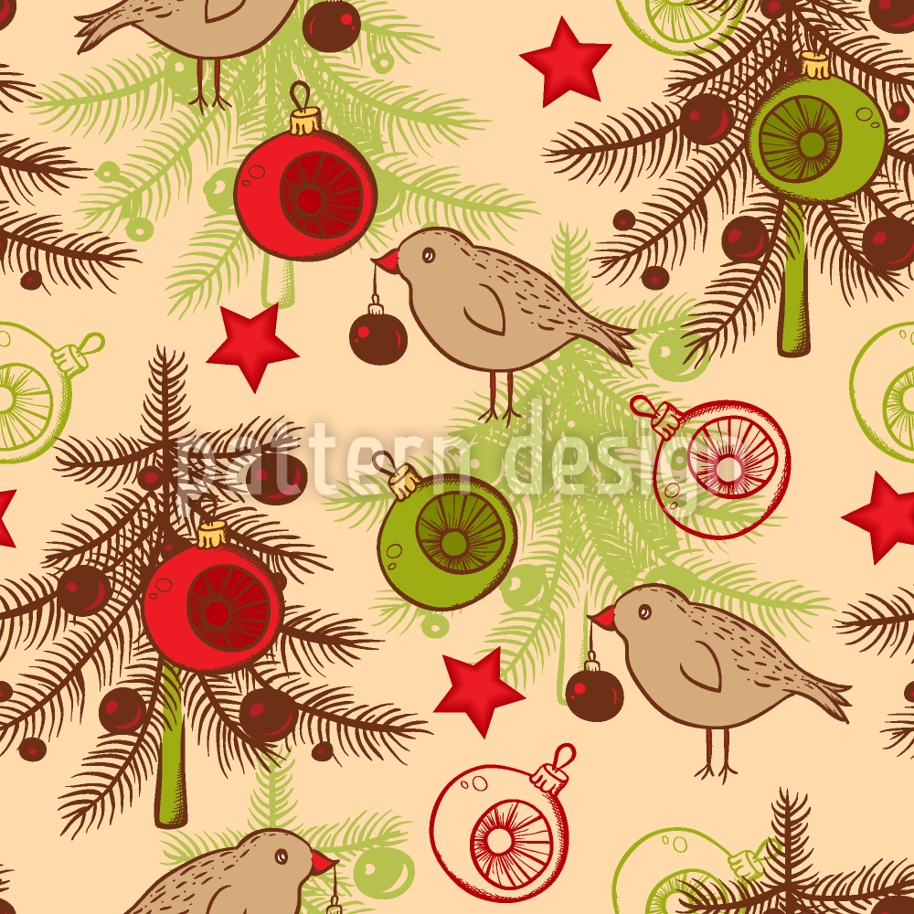 Noel Ağaçları Ve Kuşlar Dikişsiz Vektör Desen Tasarımı