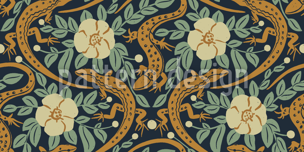 Güller Arasında Kertenkeleler Dikişsiz Vektör Desen Tasarımı