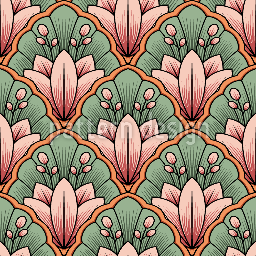 | Açıklama | Art deco esintili bir hayranın içinde stilize dokulu zambak çiçekleri. | ||