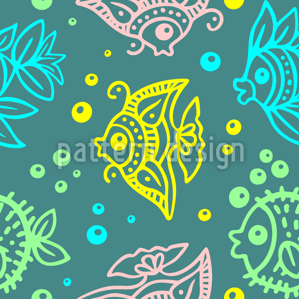 蜡染风格的鱼和泡沫 无缝矢量模式设计